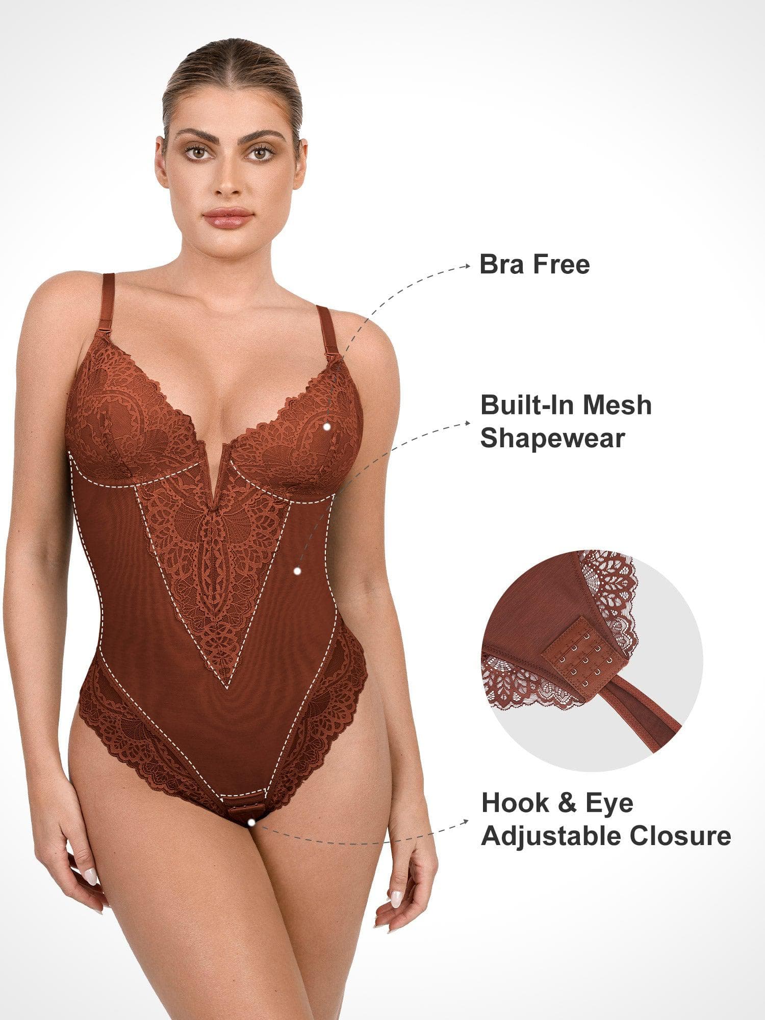 Body Gainant en Dentelle à Encolure Profonde en V avec Tanga Sculptant